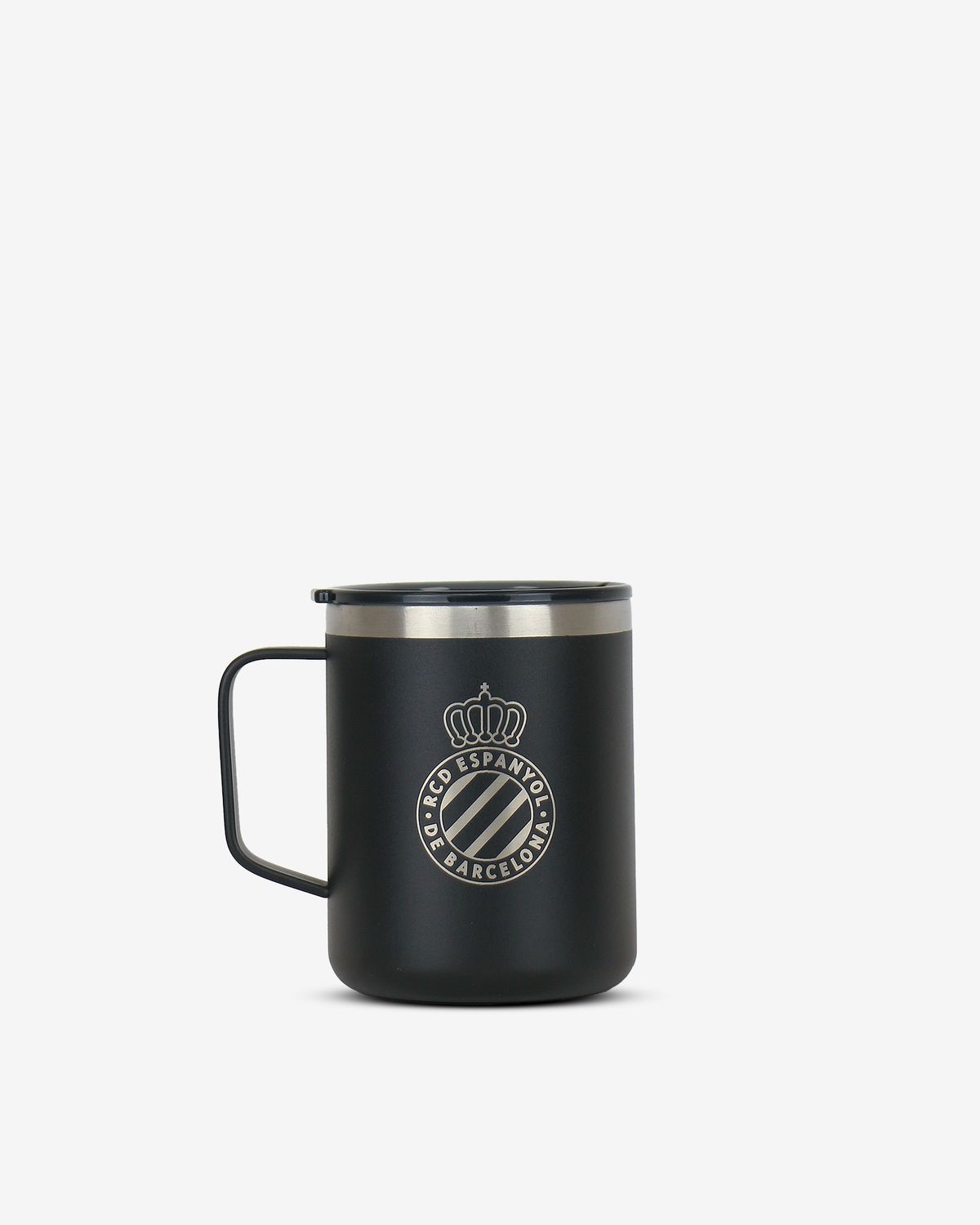 Taza termo Runbott Original Mug Espanyol Escudo de 400 ml en color negro, fabricada en acero inoxidable para mantener tus bebidas calientes o frías durante horas. Ideal para aficionados al fútbol que quieren llevar su pasión al día a día. Con escudo del Espanyol grabado en relieve y acabado elegante, es perfecta para el hogar, la oficina o los viaj