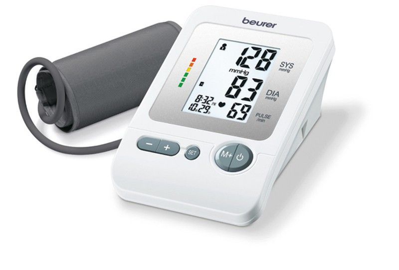 Tensiómetro de brazo Beurer con pantalla digital clara que muestra presión arterial y pulso. Diseño compacto y fácil de usar, ideal para monitorear la salud cardiovascular en casa. Fabricado en plástico resistente, incluye manguito ajustable para una medición precisa y cómoda. Perfecto para adultos que desean controlar su presión arterial de forma