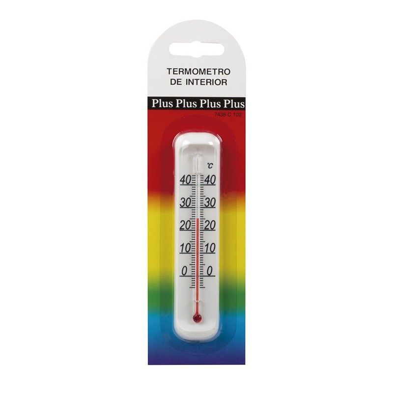Termómetro de interior Plus Plus Plus Plus, ideal para medir la temperatura en hogares, oficinas o habitaciones. Con escala clara de 0 a 40°C y líquido rojo fácil de leer, ofrece precisión y visibilidad. Empaquetado en blister con fondo de colores que indican rangos térmicos. Perfecto para mantener un ambiente cómodo y saludable.