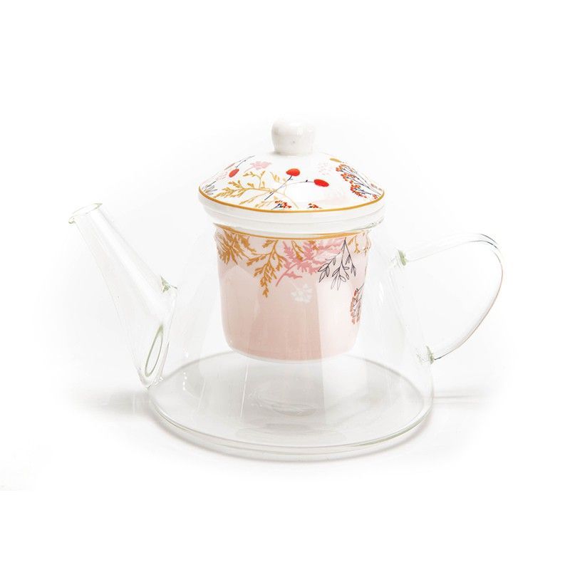 Tetera de vidrio y porcelana con elegante diseño floral en tonos rosa y dorado, ideal para disfrutar infusiones con estilo. Fabricada con materiales de calidad, combina la transparencia del vidrio con la delicadeza de la porcelana. Perfecta para uso diario o como regalo sofisticado para amantes del té.