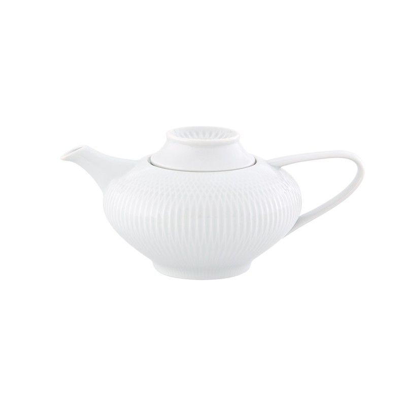 Tetera S de porcelana blanca, ideal para amantes del té que buscan elegancia y funcionalidad. Con diseño texturizado de rayas verticales, tapa con filtro integrado y asa ergonómica, ofrece un vertido suave y controlado. Perfecta para uso diario o como regalo sofisticado. Dimensiones: 19,8 x 13 x 9,1 cm.