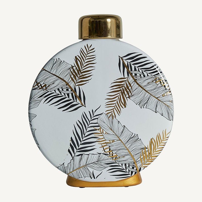 Tibor decorativo de cerámica en blanco y dorado con diseño tropical de hojas en negro y oro. Ideal para decorar mesas, estanterías o rincones de tu hogar con un toque sofisticado y natural. Su forma redondeada y acabado brillante lo convierten en un elemento decorativo versátil y elegante.