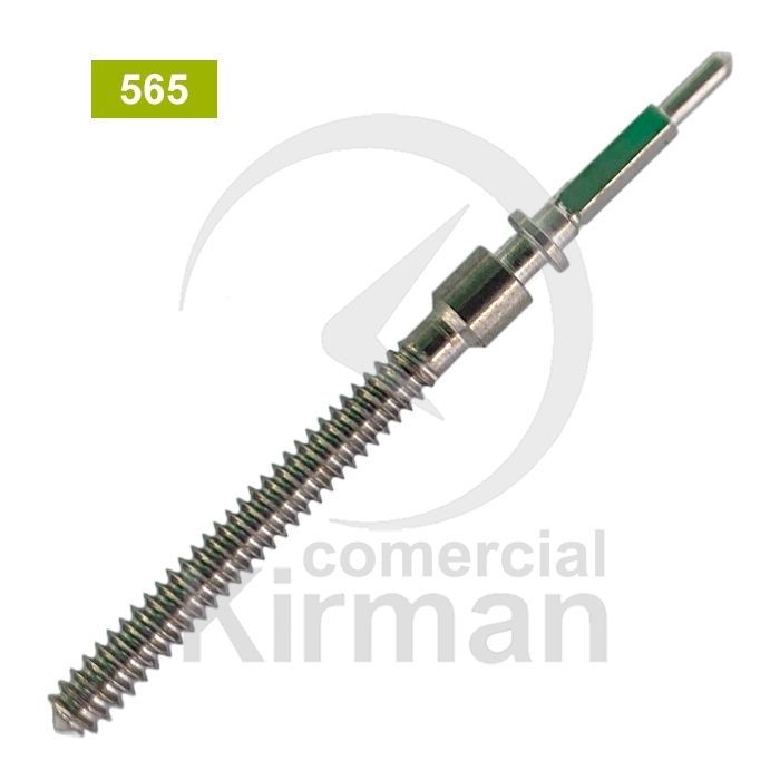 Tija de movimiento para reloj de metal, modelo 565, fabricada en acero inoxidable. Diseño robusto con rosca completa y extremo puntiagudo para una instalación precisa. Ideal para relojeros y reparaciones de relojes mecánicos. Alta calidad y durabilidad garantizada.