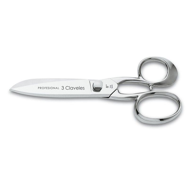 Tijera de cocina profesional de 20 cm en acero inoxidable, ideal para cortar alimentos con precisión y facilidad. Diseño ergonómico y acabado brillante, perfecta para cocineros que buscan calidad y durabilidad. Incluye marca '3 Claveles' en la hoja, garantizando un corte limpio y seguro en la cocina.