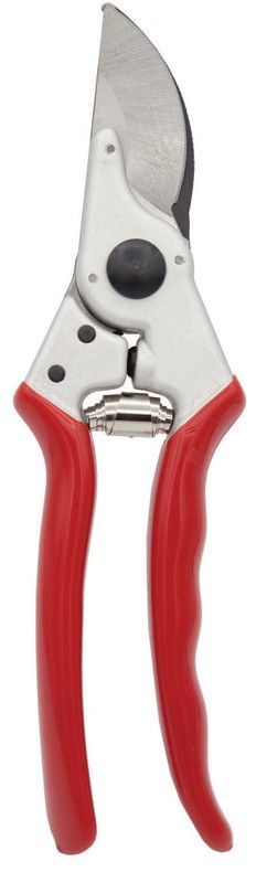 Tijera de poda profesional con hojas de acero inoxidable y manijas ergonómicas de plástico rojo. Diseño robusto y cómodo para cortar ramas y tallos con precisión. Ideal para jardineros y amantes del jardín que buscan herramientas de calidad y durabilidad. Perfecta para mantenimiento de arbustos, setos y plantas ornamentales.