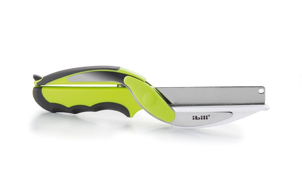 Tijera Duo de cocina con diseño innovador que combina cuchillo y tabla en una sola herramienta. Ideal para cortar y picar alimentos con precisión. Fabricada con mango de plástico ergonómico en verde y negro, y hoja de acero inoxidable resistente. Perfecta para cocineros que buscan eficiencia y comodidad en la cocina.