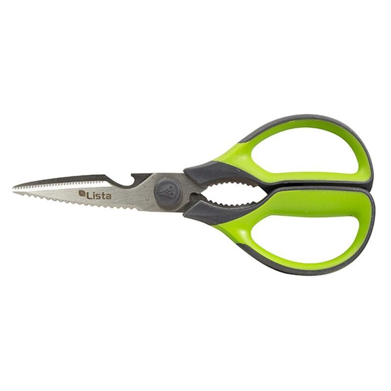 Tijera multiusos Lista de 220 mm con hojas de acero inoxidable y punta dentada, ideal para cortar plantas, ramas finas o materiales ligeros. Manijas ergonómicas en verde y gris para un agarre cómodo y seguro. Perfecta para jardinería, cocina o tareas domésticas. Alta calidad y durabilidad.