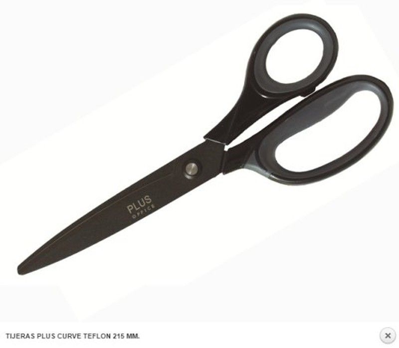 Tijeras de oficina PLUS con hojas curvas y acabado teflón de 215 mm, ideales para cortes precisos en papel, cartulina y materiales finos. Fabricadas en acero inoxidable resistente y con manijas de plástico negro ergonómicas para un agarre cómodo. Perfectas para uso diario en oficinas, escuelas o en casa.