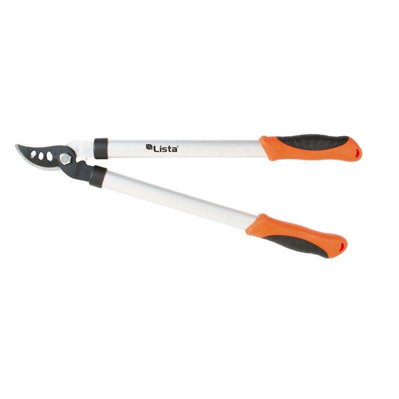 Tijera podadora de dos manos Lista con manijas de aluminio y mango ergonómico en naranja y negro. Ideal para jardinería, permite cortes precisos en ramas y arbustos con mayor alcance. Fabricada con cuchillas de acero inoxidable resistentes y duraderas. Perfecta para jardineros que buscan eficiencia y comodidad en el cuidado de su jardín.