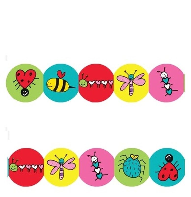 Tiras de papel decorativas con diseño de insectos del amor, ideales para manualidades infantiles y decoración de fiestas. Cada círculo de colores vivos muestra mariquitas, abejas y libélulas con corazones, perfectas para proyectos creativos en casa o en clase. Hechas de papel de calidad, fáciles de recortar y pegar. Ideal para niños y actividades e