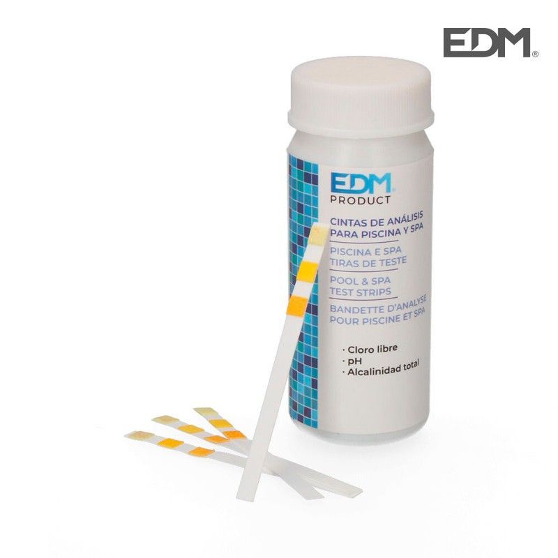 Tiras reactivas para análisis de cloro libre, pH y alcalinidad total en piscinas y spas. Contenido: 50 unidades. Fáciles de usar para mantener el agua en perfectas condiciones. Ideal para propietarios de piscinas y spas que buscan un control rápido y preciso de los parámetros del agua. Bote de plástico con etiqueta decorativa y tiras de prueba visi
