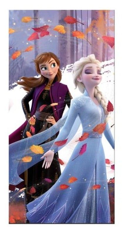 Toalla de microfibra Frozen 70x140 cm con estampado de Elsa y Anna en un escenario mágico de otoño e invierno. Ideal para niños y fans de la película, fabricada en poliéster suave y absorbente. Perfecta para el baño o la piscina, con colores vivos y diseño detallado que encantará a los más pequeños.