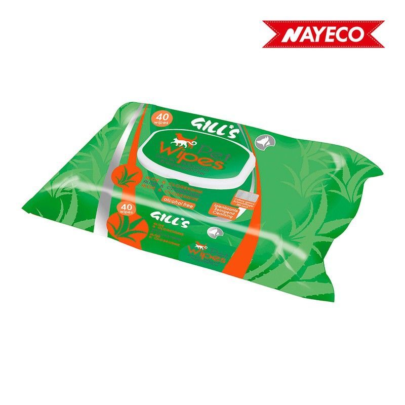 Envase de plástico con diseño de hoja verdeEtiqueta con texto 'gill's wipes'Indicación de 40 toallitasMarca 'naveco' en la esquina superior derechaEtiqueta 'alcohol free' y 'intensive cleaning'