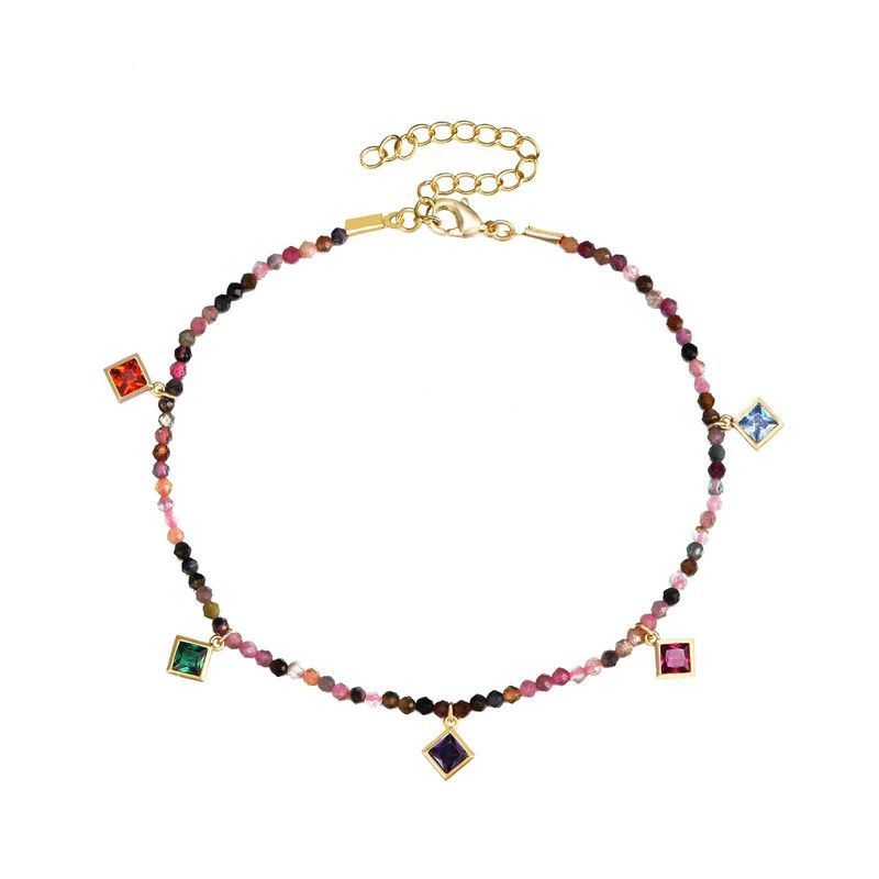 Tobillera elegante con cadena dorada y cuentas de turmalina en tonos rosados, negros y marrones. Incluye cinco colgantes cuadrados con piedras de colores vibrantes: naranja, verde, azul, morado y rosa. Ideal para mujeres que buscan un accesorio sofisticado y colorido para complementar sus looks diarios o especiales. Hecha con materiales de calidad