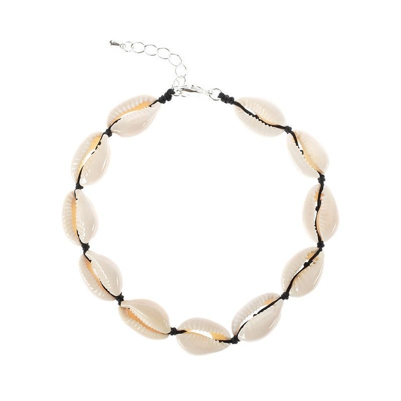 Tobillera VAR0040 con conchas naturales blancas y cuerda negra, ideal para looks bohemios y veraniegos. Cierre metálico plateado con cadena ajustable para un ajuste perfecto. Perfecta para combinar con vestidos de playa o bikinis. Materiales naturales y diseño elegante para un toque de estilo tropical.