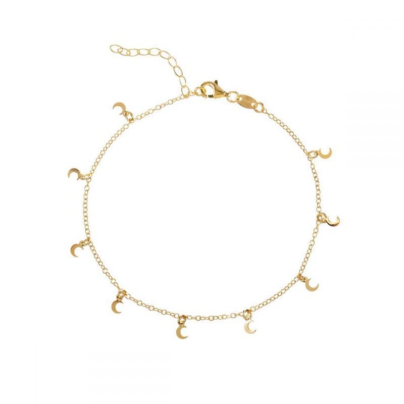 Tobillera dorada con diseño elegante y delicado, ideal para mujeres que buscan un toque sofisticado en sus looks. Fabricada en metal con acabado dorado, presenta pequeños colgantes en forma de media luna que aportan un aire bohemio y femenino. Cuenta con cierre de mosquetón y cadena ajustable (21+5 cm) para un ajuste perfecto. Perfecta para combina