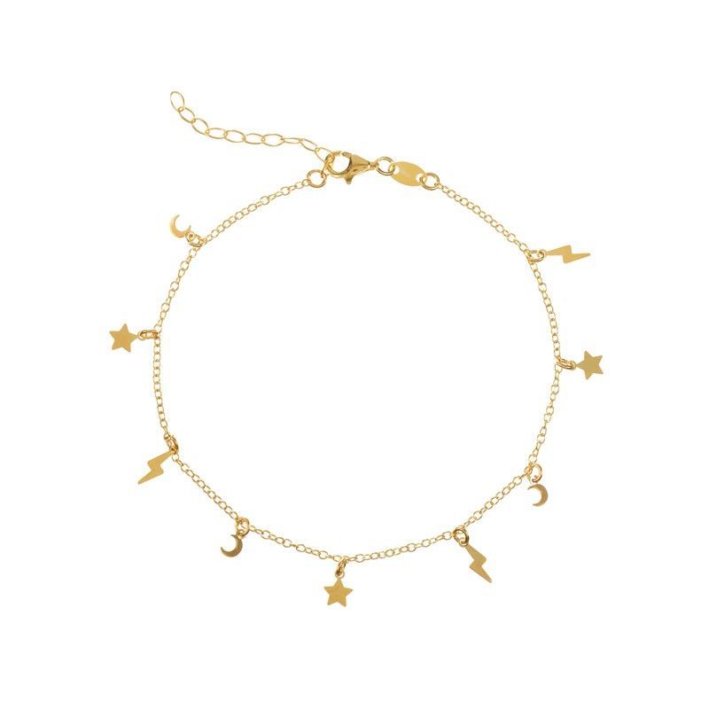 Tobillera dorada con diseño celestial, ideal para mujeres que buscan un toque de elegancia y fantasía. Fabricada en metal con acabado dorado, presenta colgantes de estrellas, lunas y rayos que brillan con sutileza. Perfecta para usar con vestidos de verano, bikinis o looks casuales. Incluye extensión para ajustarla cómodamente a tu tobillo. Un acce
