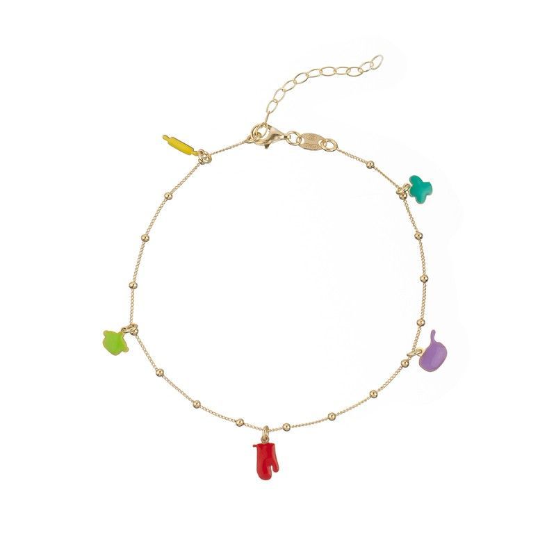 Tobillera de metal dorado con colgantes en esmalte de colores inspirados en utensilios de cocina. Ideal para amantes de la cocina y la moda casual. Diseño divertido y original, perfecto para combinar con vestidos o shorts. Cierre seguro con extensor para ajuste cómodo. Un accesorio único que aporta estilo y personalidad a tu look diario.