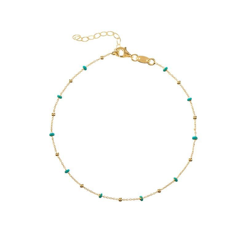 Tobillera fina en metal dorado con detalles de bolas turquesa, ideal para looks elegantes y veraniegos. Diseño delicado y versátil, perfecto para combinar con vestidos o sandalias. Cierre seguro con mosquetón y cadena extensible para ajuste cómodo. Joyería de calidad para mujeres que buscan un toque sofisticado y colorido en sus accesorios.