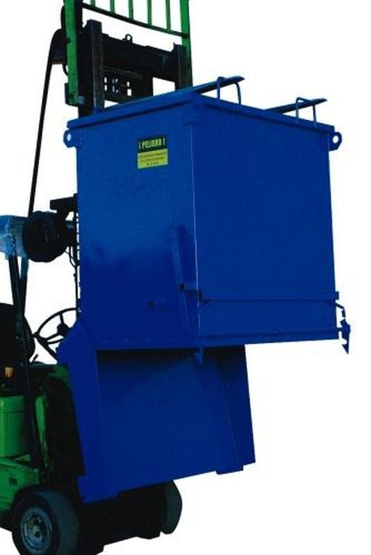 Tolva de descarga inferior modelo 12047, fabricada en metal resistente, ideal para transporte y vaciado eficiente de residuos en obras, industrias o granjas. Diseño robusto y seguro, montable en montacargas, con manijas laterales para mayor control. Perfecta para operaciones de carga y descarga en entornos exigentes.