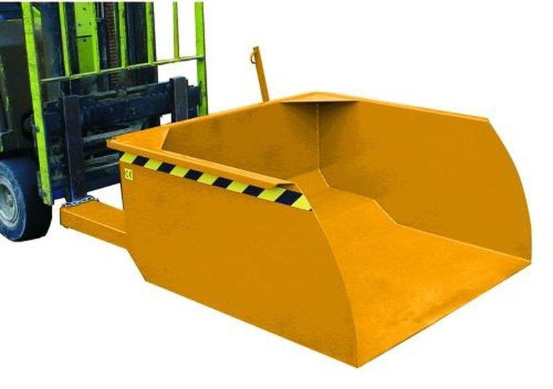 Tolva de recogida de granel de 1840x1120x550 mm, fabricada en metal resistente, ideal para uso en almacenes, obras o jardines. Diseñada para montar en carretillas elevadoras, permite el transporte eficiente de materiales sueltos como tierra, grava o residuos. Incluye franjas reflectantes amarillo y negro para mayor visibilidad y seguridad. Solución
