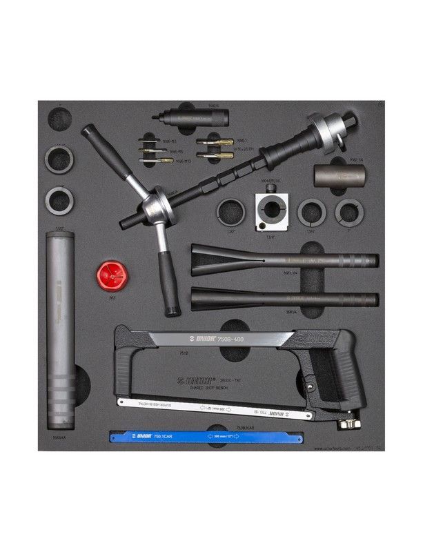 Kit de herramientas para bicicletas Unior Shared Tool Drawer 1 V3 Black, ideal para ciclistas que necesitan mantener su bicicleta en perfecto estado. Incluye llave inglesa, destornilladores, llaves hexagonales y más, todo organizado en un estuche negro con recortes personalizados. Fabricado en acero inoxidable y plástico resistente, garantiza durab