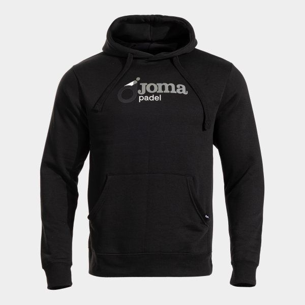 Sudadera con capucha Joma Padel en color negro, ideal para deportistas y amantes del pádel. Confeccionada en mezcla de poliéster y algodón, ofrece comodidad y estilo. Incluye bolsillo frontal, cordón ajustable y logo distintivo en blanco. Perfecta para entrenamientos, descanso o uso diario con un toque deportivo.
