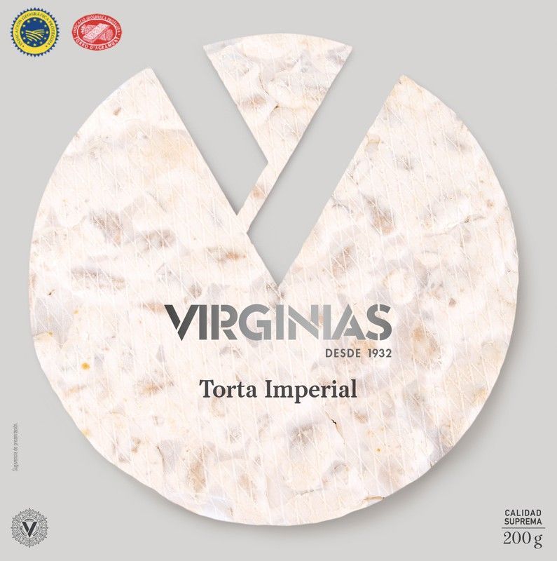 Torta Imperial de Virginias, 200 g, sin gluten, elaborada con almendras de calidad suprema desde 1932. Ideal para disfrutar como postre o merienda gourmet. Textura crujiente y sabor intenso, perfecta para amantes de los dulces tradicionales de alta calidad.