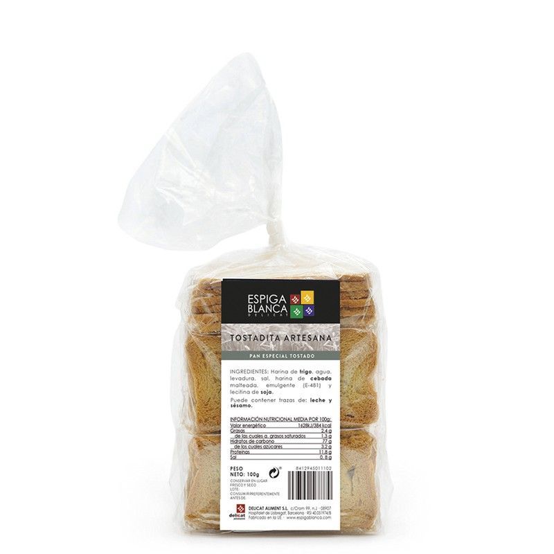 Tostadita artesana de 100 gramos, ideal para desayunos o meriendas saludables. Envasada en plástico transparente para mantener su frescura. Hecha con harina de trigo y aceite de oliva, sin conservantes. Perfecta para tostar y disfrutar con mantequilla, queso o mermelada. Producto de calidad, elaborado con ingredientes naturales.