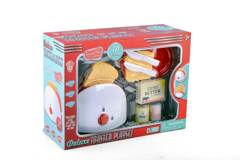 Juego de simulación de tostadora con desayuno para niños, ideal para juegos de roles y aprendizaje temprano. Incluye 10 piezas como tostadora, pan, mantequilla y mermelada. Diseño colorido y realista en caja rectangular con ventana transparente. Fomenta la imaginación y habilidades sociales en niños pequeños.