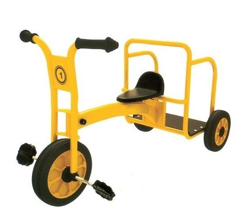 Triciclo escolar taxi amarillo y negro, ideal para niños pequeños. Fabricado en metal y plástico resistente, con asiento cómodo, pedales seguros y barra de protección trasera. Diseño divertido y funcional para que los más pequeños disfruten aprendiendo a pedalear en un entorno seguro y divertido.