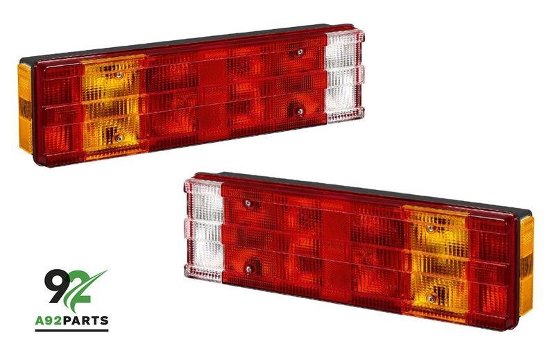 Luces traseras rectangulares para vehículos comerciales, compatibles con modelos Mercedes. Diseño robusto con secciones rojas, amarillas y blancas para mayor visibilidad. Fabricadas en plástico resistente, ideales para señalización trasera en camiones y vehículos pesados. Incluye montaje con tornillos para instalación segura. Adecuadas para uso pro