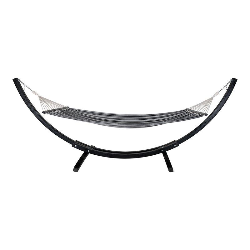Tumbona de exterior con estructura metálica negra y hamaca de tejido resistente con rayas horizontales. Ideal para relajarse al aire libre, ofrece comodidad y estilo. Perfecta para jardines, terrazas o espacios de ocio. Diseño moderno y duradero.