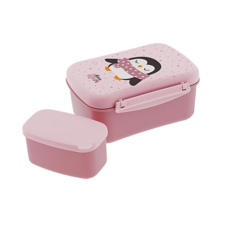 Fiambrera infantil hermética de plástico en color rosa, con diseño divertido de pingüino con lazo y lunares. Incluye recipiente adicional para mayor organización. Ideal para niños, perfecta para el colegio o viajes. Fácil de transportar gracias a sus asas laterales. Mantén la comida fresca y organizada con estilo.