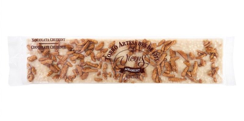 Turrón Vicens de chocolate blanco crujiente especial, con trozos de nueces visibles en su envase transparente. Ideal para disfrutar como postre o regalo gourmet. Elaborado con ingredientes de calidad, este turrón artesano combina textura crujiente y sabor dulce, perfecto para amantes de los dulces tradicionales.