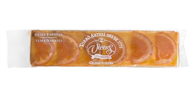 Turrón Vicens Yema a la Naranja Especial de 300g, un dulce artesanal con gema de naranja y yema de huevo, elaborado con calidad suprema desde 1874. Ideal para disfrutar en cualquier momento o como regalo gourmet. Envase transparente que muestra su textura y trozos de naranja.