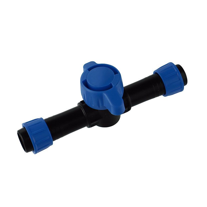 Válvula de corte para cinta plana de 16 mm, ideal para sistemas de riego por goteo en jardín. Fabricada en plástico resistente, permite controlar fácilmente el flujo de agua con su manija giratoria. Diseño compacto y seguro, con conectores azules para una instalación rápida y sin fugas. Perfecta para jardinería y cultivos en espacios pequeños o med