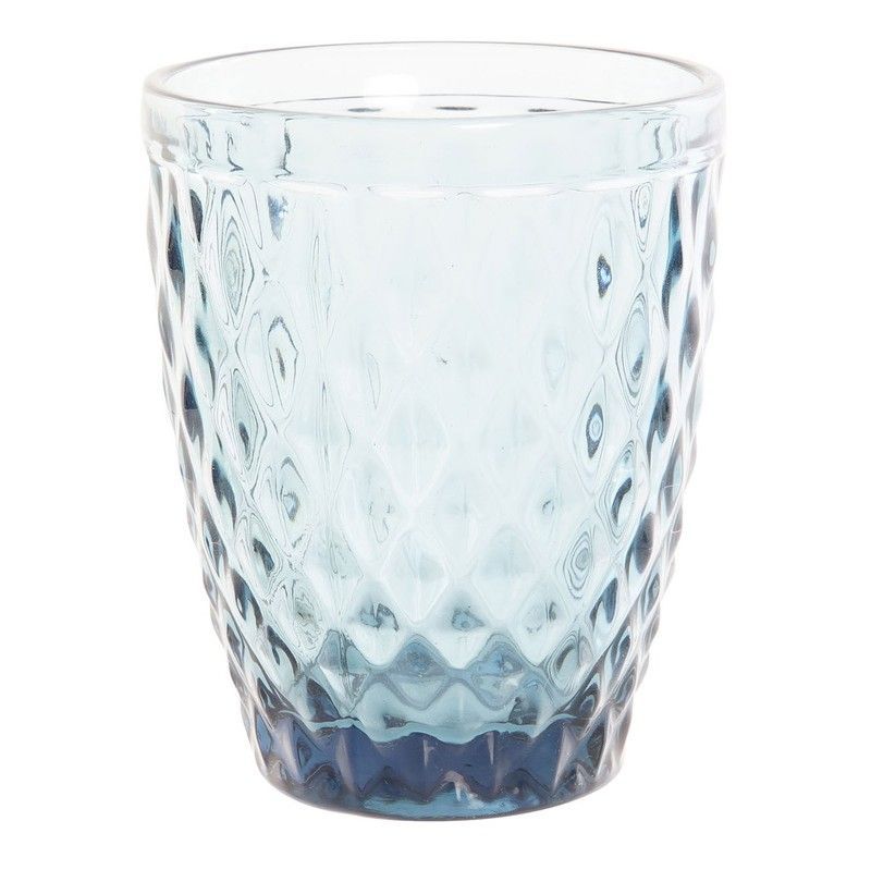 Vaso de cristal en tono azul con diseño facetado y textura geométrica, ideal para agua, cócteles o bebidas frías. Su acabado elegante y moderno lo convierte en un complemento perfecto para cualquier mesa. Fabricado en cristal de calidad, resistente y fácil de limpiar. Perfecto para uso diario o ocasiones especiales.