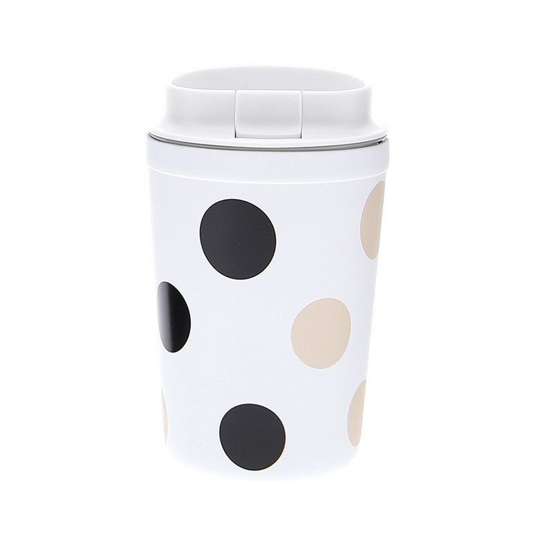 Vaso térmico Ice Dot'S Creative Story de 350 ml, ideal para llevar café, té o bebidas frías. Con diseño moderno de lunares negros y beige sobre fondo blanco, fabricado en acero inoxidable y plástico. Tapa hermética con bisagra para evitar derrames. Perfecto para el trabajo, el colegio o el día a día.