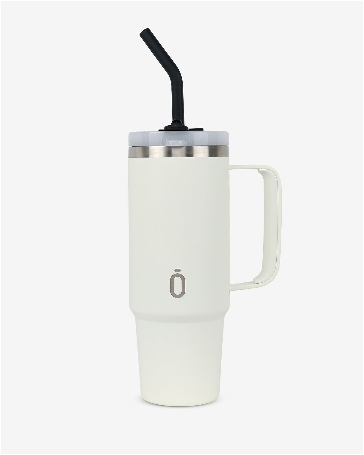 Vaso térmico Runbott Original Latt de 800 ml en color blanco, ideal para llevar bebidas calientes o frías durante todo el día. Fabricado en acero inoxidable con tapón de plástico y pajita flexible negra. Diseño elegante con asa lateral y logotipo plateado. Perfecto para el trabajo, el gimnasio o viajes. Mantén tus bebidas a la temperatura ideal con