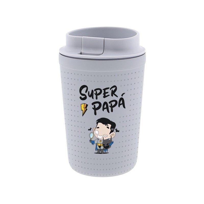Vaso térmico Shadow de 350 ml con diseño 'Super Papá', perfecto como regalo para padres. Cuerpo blanco con puntos y tapa gris, con ilustración de superhéroe. Fabricado en plástico y acero inoxidable, ideal para llevar bebidas calientes o frías durante todo el día. Un detalle divertido y práctico para celebrar a los papás.