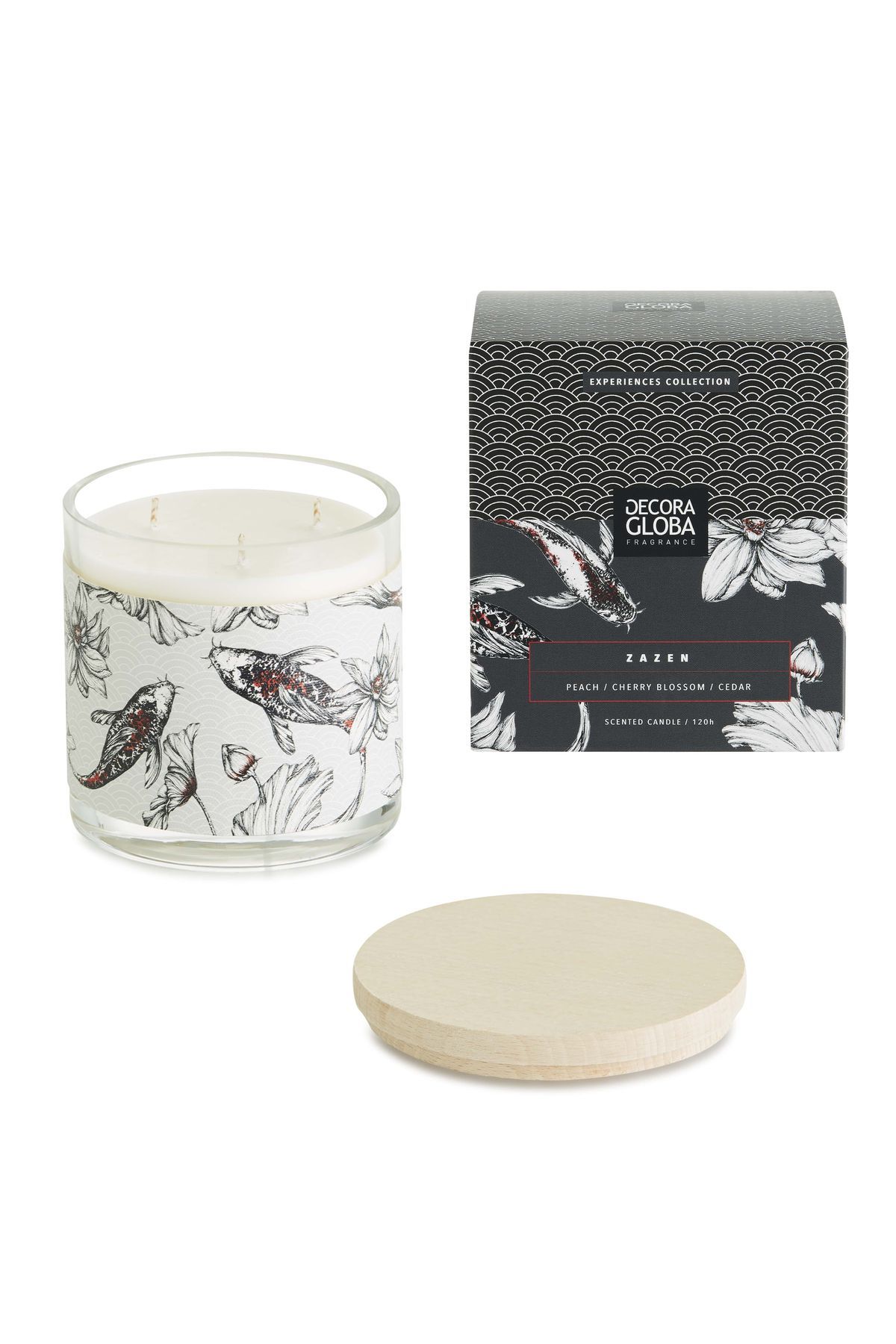 Vela aromática grande Zazen de 700 gramos de la colección Experiencias de Decoragloba. Con fragancia de melocotón, flor de cerezo y cedro, ideal para crear un ambiente relajante y sofisticado en tu hogar. Presentada en un elegante recipiente de vidrio con diseño de koi y flores, acompañada de su caja decorativa y tapón de madera. Perfecta para espa