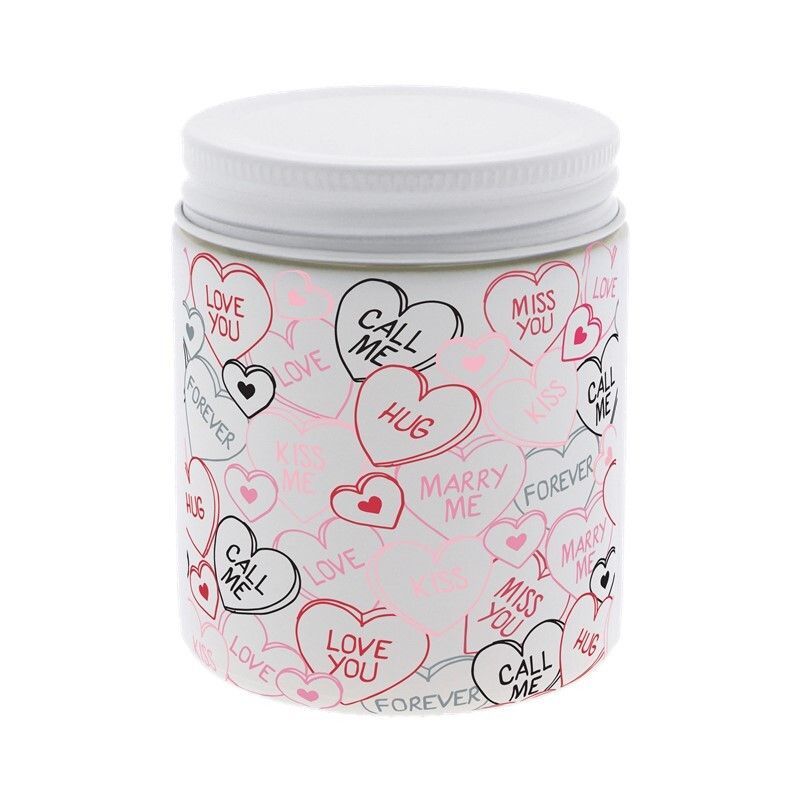 Vela aromática Grey Love You en bote decorativo con diseño romántico de corazones y mensajes de amor en inglés. Ideal como regalo para parejas, aniversarios o San Valentín. Su envase elegante y colorido combina tonos blancos, rosas y negros, creando un ambiente cálido y acogedor. Perfecta para decorar el hogar con un toque de ternura y fragancia.