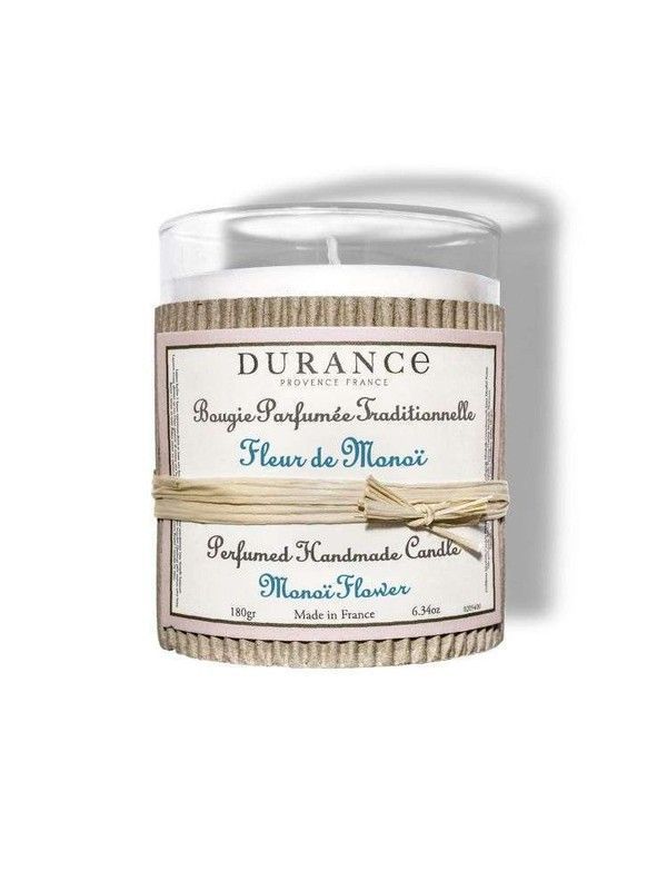 Vela artesanal Durance de 180 gramos con aroma a Flor Monoï, elaborada tradicionalmente en Provenza, Francia. Ideal para ambientar espacios con un toque sofisticado y relajante. Presentada en un elegante recipiente de vidrio con etiqueta decorativa y cinta de yute. Perfecta para regalar o disfrutar en casa.