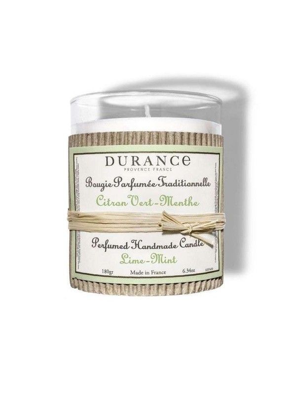 Vela artesanal Durance de 180 gr, con fragancia Limón verde-Menta, elaborada en Francia. Ideal para ambientar espacios con un aroma fresco y revitalizante. Presentada en un elegante recipiente de vidrio con etiqueta clásica y cinta de rafia, perfecta para decorar tu hogar o regalar con estilo.