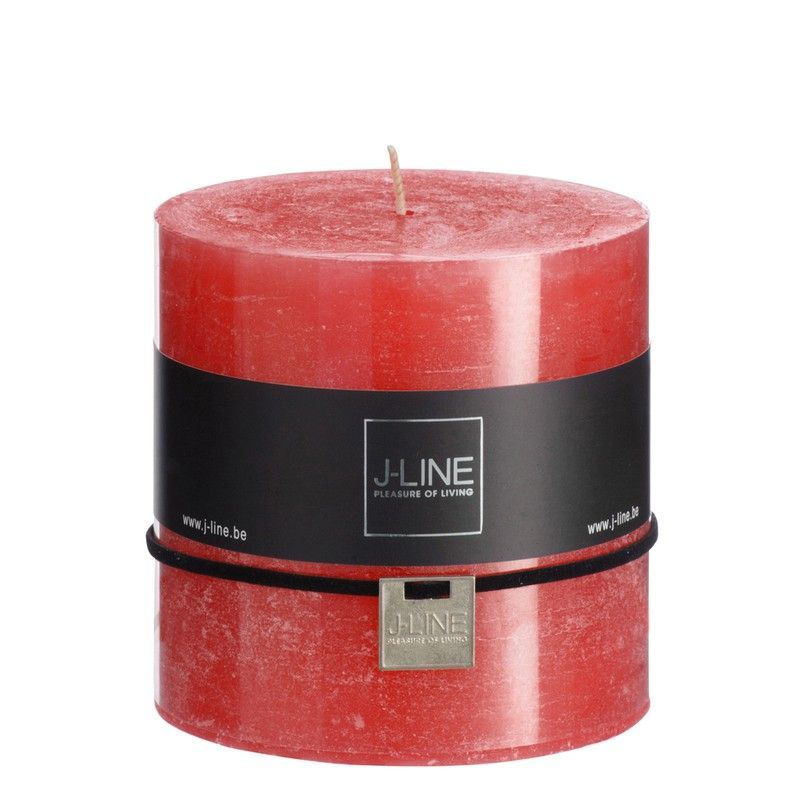 Vela cilíndrica de cera roja de 10x10x10 cm, ideal para decorar espacios con estilo y elegancia. Con acabado mate y textura granulada, incluye etiqueta negra con logotipo J-LINE y cinta decorativa. Perfecta para crear ambientes cálidos y acogedores en casa o en eventos especiales.