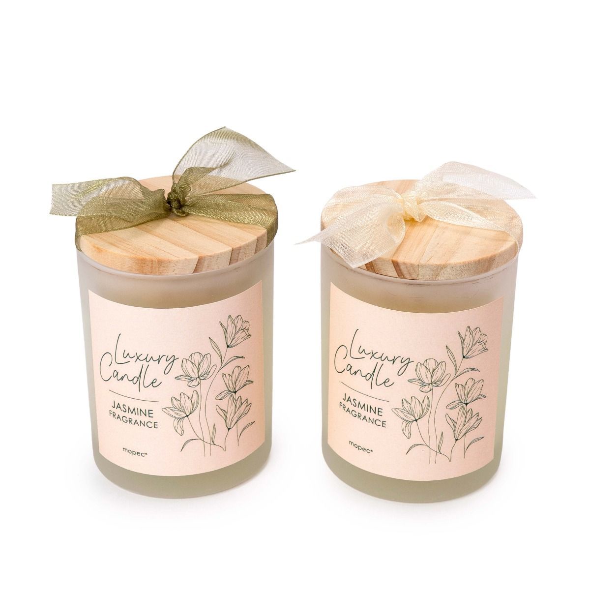 Vela de jazmín de 95 gramos en frasco de vidrio con tapa de madera y lazo decorativo. Ideal como recordatorio de boda o regalo elegante. Diseño sofisticado con etiqueta rosa y estampado floral. Fragancia delicada y duradera para ambientar espacios con estilo.