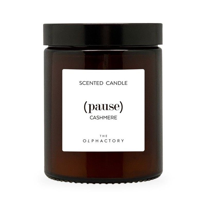 Vela perfumada Cashmere de The Olphactory, con 135 gramos y duración de hasta 30 horas. Presentada en un elegante bote de vidrio marrón con tapa negra y etiqueta minimalista. Ideal para crear un ambiente cálido y sofisticado en tu hogar. Fragancia suave y envolvente, perfecta para espacios de relajación y bienestar.