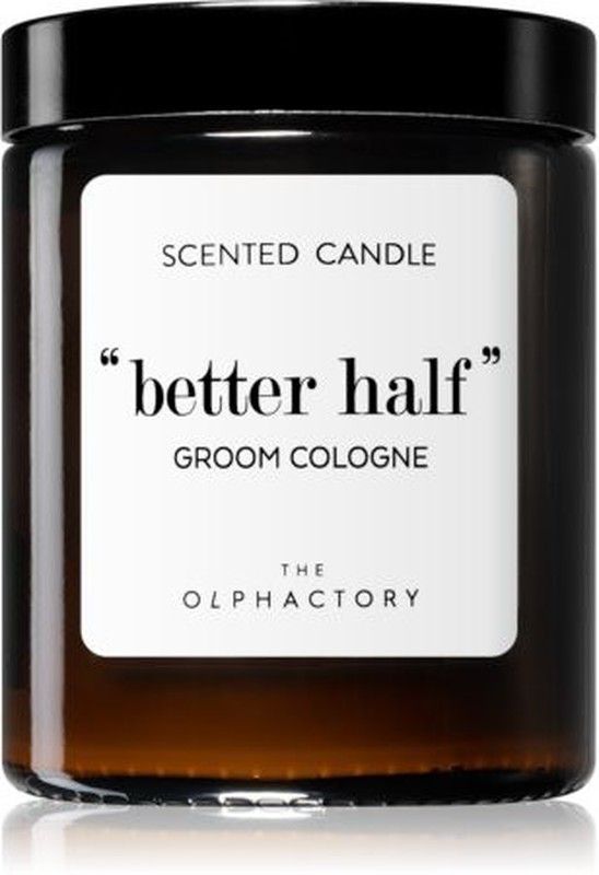 Vela perfumada 'Better Half' de The Olphactory, con aroma a cologne para novio, ideal para ambientar espacios con un toque sofisticado. Con 135 grs y duración de 30 horas, presenta un diseño elegante en bote de vidrio oscuro con etiqueta blanca minimalista. Perfecta para regalar o disfrutar en casa.