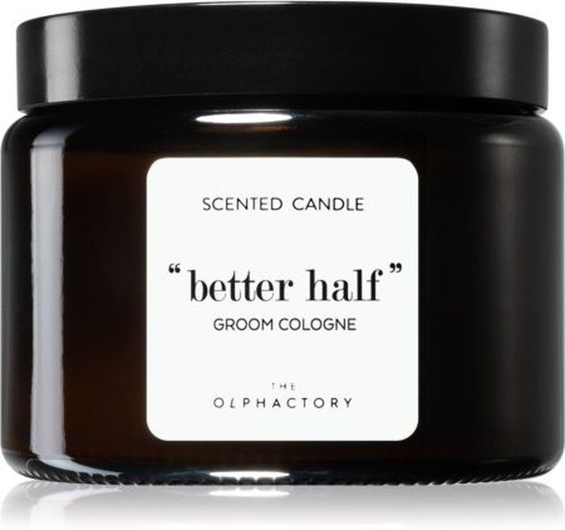 Vela perfumada 'Better Half' de The Olphactory, con aroma a cologne para novio, ideal para ambientar espacios con un toque sofisticado y masculino. Con una duración de hasta 60 horas, este producto de 360 grs combina elegancia y fragancia en un bote de vidrio oscuro con etiqueta minimalista. Perfecta para regalar o disfrutar en casa.